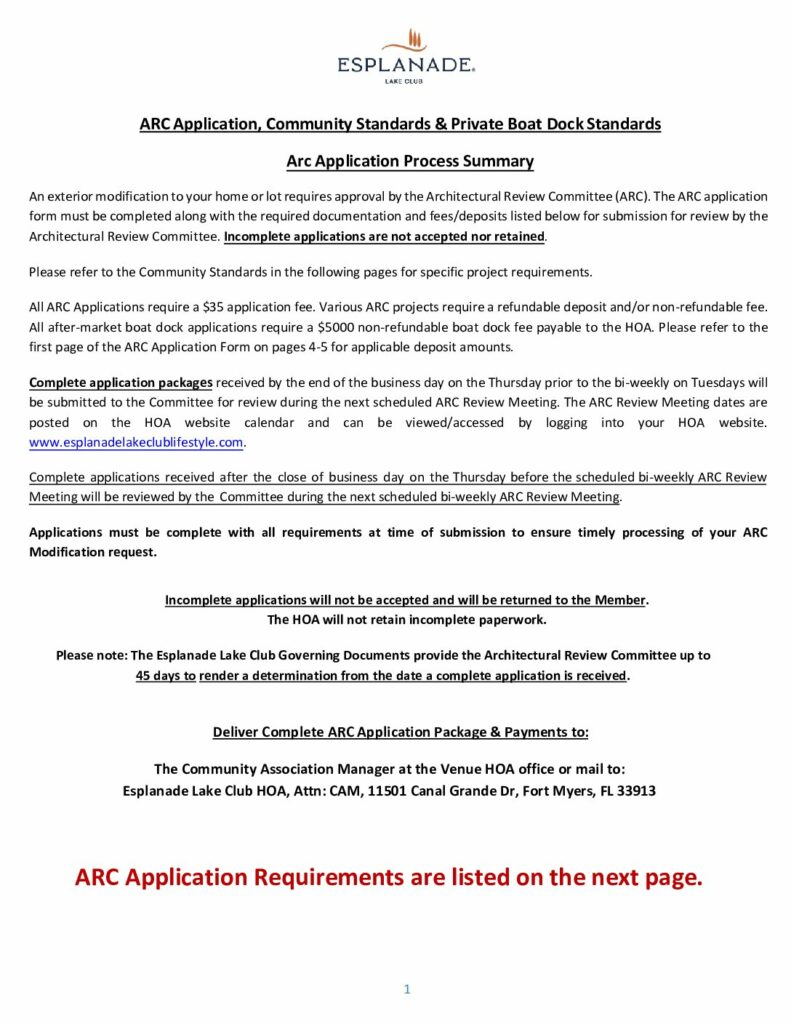 Esplanade Lake Club ARC Application Package – Summary of Process, Application Form, Community Standards & Private Boat Dock Standards
